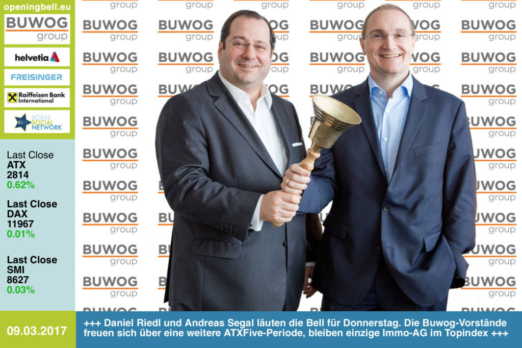 Opening Bell: Daniel Riedl und Andreas Segal läuten die Opening Bell für Donnerstag. Die Buwog-Vorstände freuen sich über eine weitere ATXFive-Periode, bleiben einzige Immo-AG im Topindex http://www.buwog.com https://www.facebook.com/groups/GeldanlageNetwork/