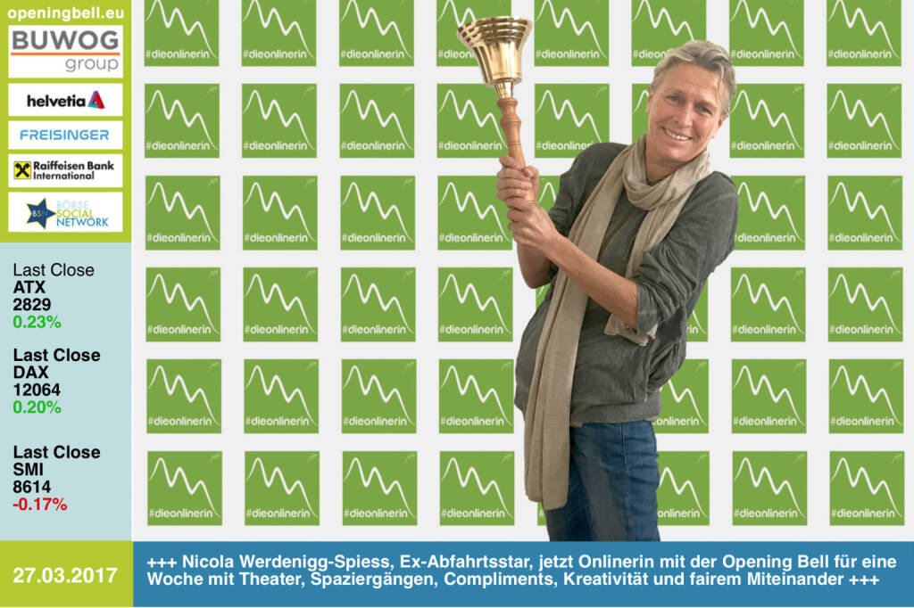 Opening Bell: Nicola Werdenigg-Spiess, Ex-Abfahrtsstar (Olympia-Vierte 1976 in Innsbruck), jetzt http://onlinerin.at mit u.a. Betreuung von KMUs läutet die Opening Bell für eine Woche mit Theater, Spaziergängen, Compliments, Kreativität und fairem Miteinander https://www.facebook.com/groups/GeldanlageNetwork/ https://www.facebook.com/groups/Sportsblogged
