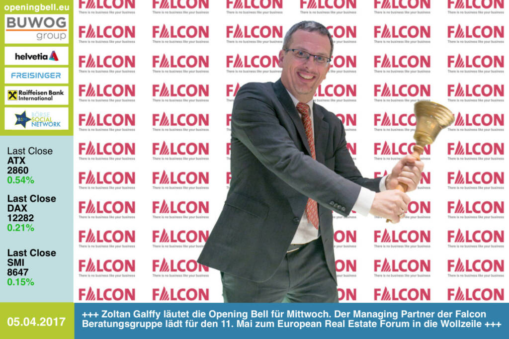 Opening Bell: Zoltan Galffy läutet die Opening Bell für Mittwoch. Der Managing Partner der Falcon Beratungsgruppe lädt für den 11. Mai zum European Real Estate Forum in die Wollzeile. Infos: office@dmv-immobilien.at https://www.facebook.com/groups/GeldanlageNetwork/