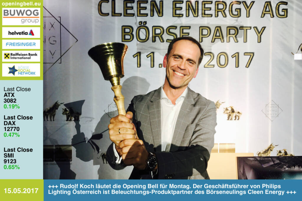 Opening Bell: Rudolf Koch läutet die Opening Bell für Montag. Der Geschäftsführer von Philips Lighting Österreich ist Beleuchtungs-Produktpartner des Börseneulings Cleen Energy http://www.lighting.philips.at/ http://www.cleen-energy.com https://www.facebook.com/groups/GeldanlageNetwork /