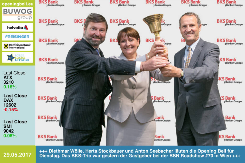 Opening Bell: Diethmar Wölle, Herta Stockbauer und Anton Seebacher läuten die Opening Bell für Dienstag. Das BKS-Trio war gestern der Gastgeber bei der BSN Roadshow #70 in Wien http://www.bks.at http://www.boerse-social.com/roadshow https://www.facebook.com/groups/GeldanlageNetwork /