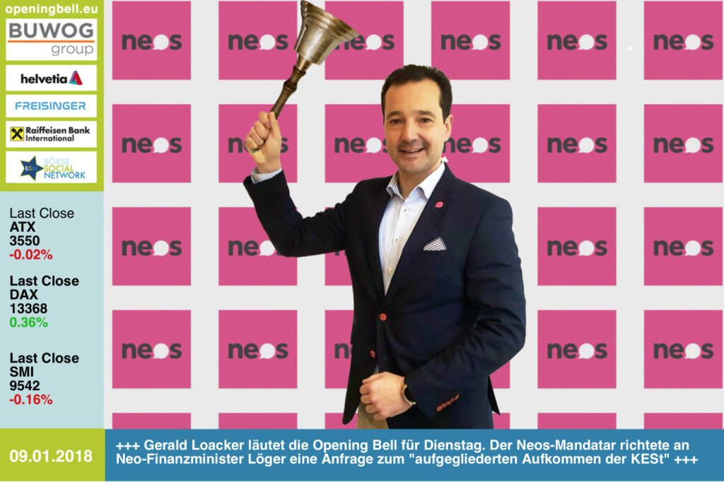 Opening Bell 9.1.: Gerald Loacker läutet die Opening Bell für Dienstag. Der Neos-Mandatar richtete an Neo-Finanzminister Löger eine Anfrage zum "aufgegliederten Aufkommen der KESt", siehe hier: https://www.parlament.gv.at/PAKT/VHG/XXVI/J/J_00020/imfnam... https://www.facebook.com/groups/GeldanlageNetwork/#goboersewien