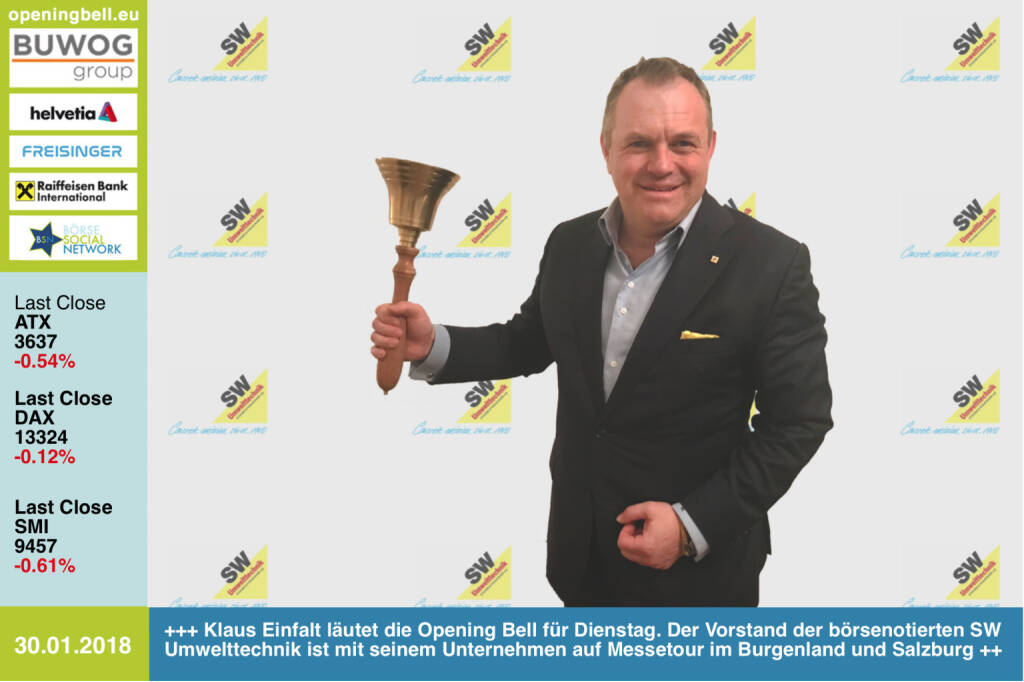 Opening Bell 30.1.: Klaus Einfalt läutet die Opening Bell für Dienstag. Der Vorstand der börsenotierten SW Umwelttechnik ist mit seinem Unternehmen auf Messetour im Burgenland und Salzburg http://en.sw-umwelttechnik.com https://www.facebook.com/groups/GeldanlageNetwork/ #goboersewien
