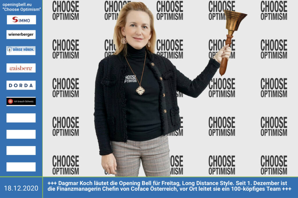 18.12.: Dagmar Koch läutet die Opening Bell für Freitag, Long Distance Style (vorher/nachher unter https://photaq.com//page/index/3781). Seit 1. Dezember ist die Finanzmanagerin Chefin von Coface Österreich, vor Ort leitet sie ein 100-köpfiges Team http://www.coface.at - mehr Choose Optimism: https://boerse-social.com/category/choose_optimism https://www. facebook.com/chooseoptimism/