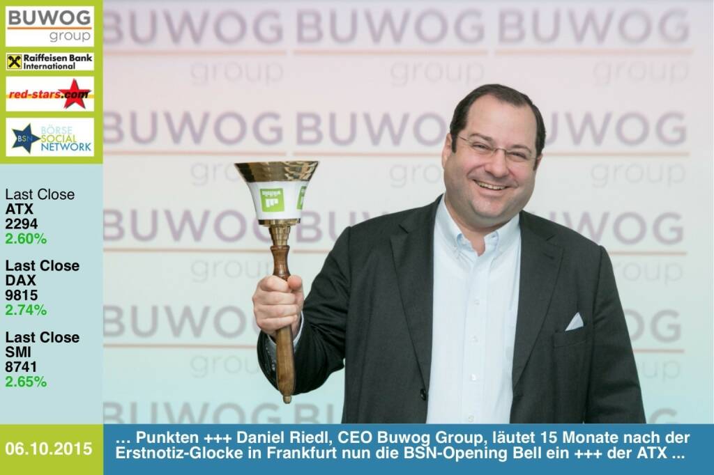 Denn ja, diese Opening Bell liegt uns sehr am Herzen und wird unsere bisher grösste virale Aktion. Beginnend mit dem 6. Oktober, wird fortan jeden Tag die Startglocke für die europäischen Börsen geläutet werden, das werden Tag für Tag andere Leute sein, die noch dazu unterschiedlicher nicht sein könnten. Lassen Sie sich überraschen. Den Auftakt macht jedenfalls Buwog-CEO Daniel Riedl. Und er passt perfekt, denn er war der letzte Österreicher, der an einer Börse die Opening Bell aufgrund seiner Erstnotiz erfolgreich geläutet hat. Und das ist auch schon wieder 15 Monate her. Siehe ausführliches Interview mit Riedl hier: Buwog-CEO Riedl läutet die Opening Bell für weitere Upgrades der Börsepräsenz #openingbell (Christian Drastil)
