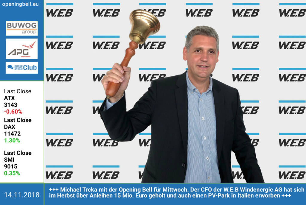 14.11.: Michael Trcka mit der Opening Bell für Mittwoch. Der CFO der W.E.B Windenergie AG hat sich im Herbst über Anleihen 15 Mio. Euro geholt und auch einen PV-Park in Italien erworben. https://www.windenergie.at https://www.facebook.com/groups/GeldanlageNetwork