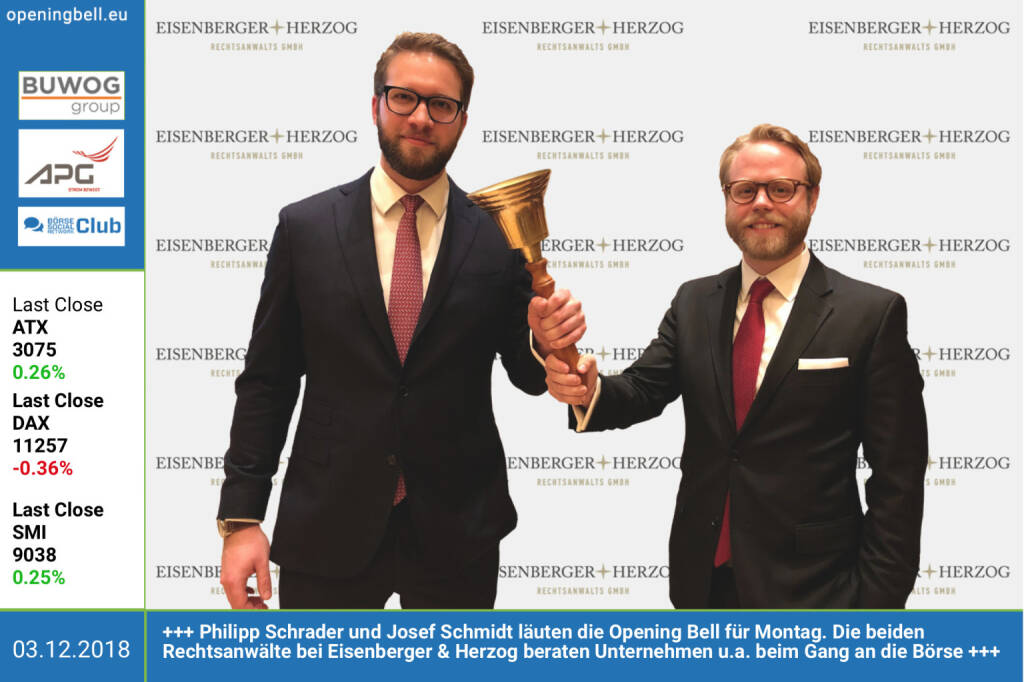 3.12.: Philipp Schrader und Josef Schmidt läuten die Opening Bell für Montag. Die beiden Rechtsanwälte bei Eisenberger & Herzog beraten Unternehmen in Kapitalmarktrechtsfragen etc. http://www.ehlaw.at https://www.facebook.com/groups/GeldanlageNetwork