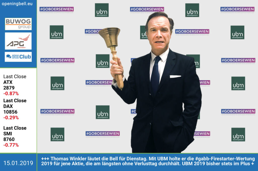 15.1.: Thomas Winkler läutet die Opening Bell für Dienstag. Mit UBM holte er die #gabb-Firestarter-Wertung 2019 für jene Aktie, die am längsten ohne Verlusttag durchhält. UBM 2019 bisher an allen 9 Handelstagen als einzige Aktie stets im Plus http://www.ubm.at http://www.boerse-social.com/gabb https://www.facebook.com/groups/GeldanlageNetwork