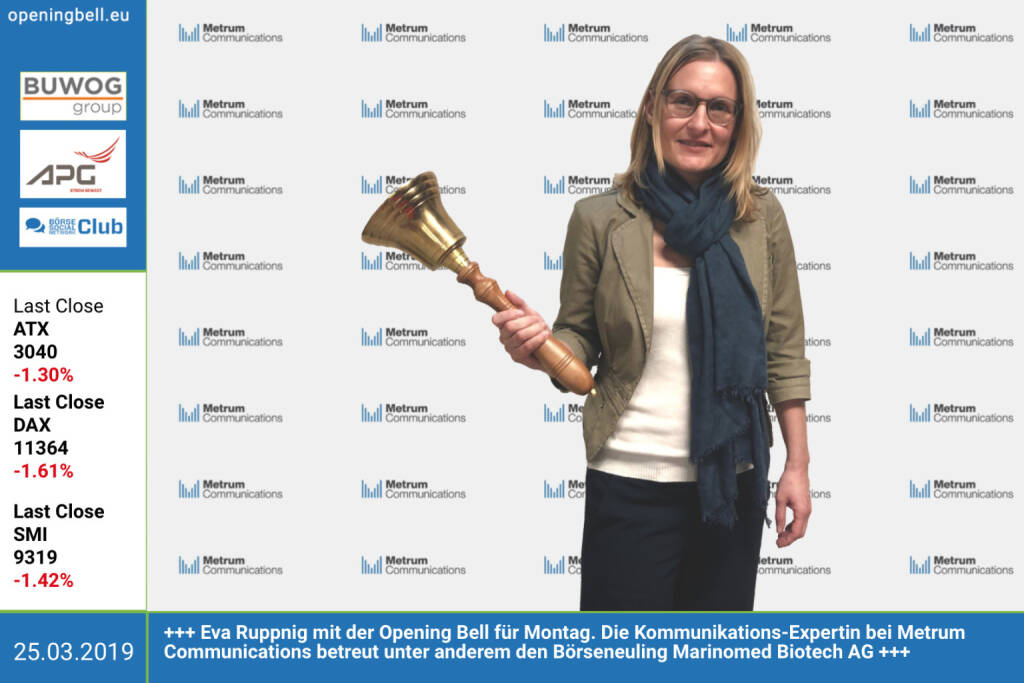 23.3.: Sabina Haas läutet die Opening Bell für Montag. Die Ex-Managerin der Wiener Börse bringt ihre Mentaltrainer-Skills in einem schönen Blog ein: http://www.christian-drastil.com/blog/sabina.haas https://www.sabinahaas.at