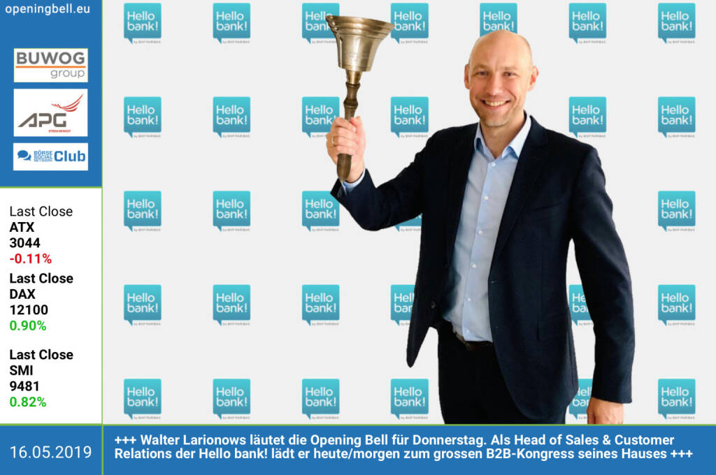19.2.: Christian Glaser läutet die Opening Bell für Dienstag. Der Director Exchange Traded Solutions bei BNP Paribas freut sich über gerade erhaltene Auszeichnung zum besten Zertifikatehaus https://www.derivate.bnpparibas.com/startseite https://www.facebook.com/groups/GeldanlageNetwork