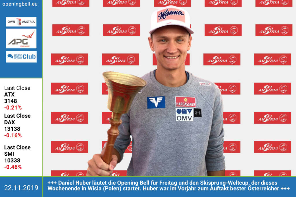 22.11.: Daniel Huber läutet die Opening Bell für Freitag und den Skisprung-Weltcup, der dieses Wochenende in Wisla (Polen) startet. Huber war im Vorjahr zum Auftakt bester Österreicher http://www.oesv.at