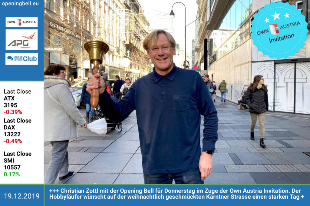 19.12.: Christian Zottl mit der Opening Bell für Donnerstag im Zuge der Own Austria Invitation. Der Hobbyläufer wünscht auf der weihnachtlich geschmückten Kärntner Strasse einen starken Business-Tag