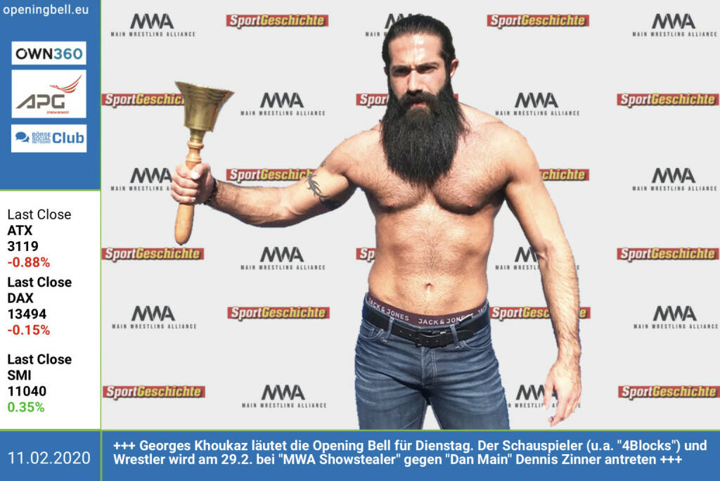 11.2.: Georges Khoukaz läutet die Opening Bell für Dienstag. Der Schauspieler (u.a. "4Blocks") und Wrestler wird am 29.2. bei "MWA Showstealer", dem Auftaktevent der neuen Promotion MWA gegen Veranstalter "Dan Main" Dennis Zinner antreten. Tickets unter: https://www.oeticket.com/eventseries/mwa-main-wrestling...