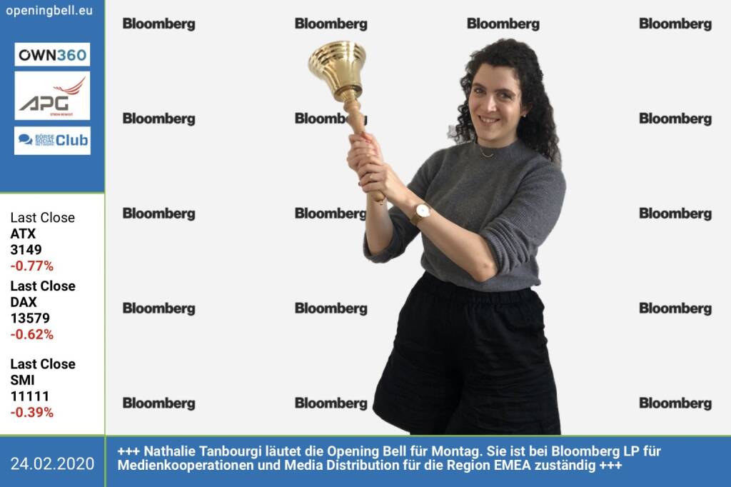 24.2.: Nathalie Tanbourgi läutet die Opening Bell für Montag. Sie ist bei Bloomberg LP für Medienkooperationen und Media Distribution für die Region EMEA zuständig https://www.bloomberg.com/europe