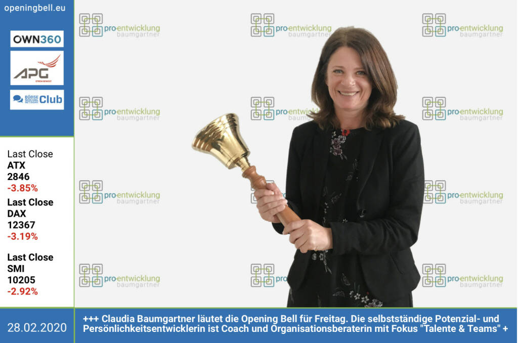 28.2.: Claudia Baumgartner läutet die Opening Bell für Freitag. Die selbstständige Potenzial- und Persönlichkeitsentwicklerin ist Coach und Organisationsberaterin mit Fokus auf Talente und Teams" bzw. regelmässige Autorin im Börse Social Magazine https://pro-entwicklung.com http://www.boerse-social.com/magazine