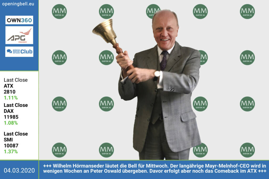 4.3.: Wilhelm Hörmanseder läutet die Opening Bell für Mittwoch. Der langährige Mayr-Melnhof-CEO wird in wenigen Wochen an Peter Oswald übergeben. Davor erfolgt aber noch das Comeback der Mayr-Melnhof-Aktie im ATX