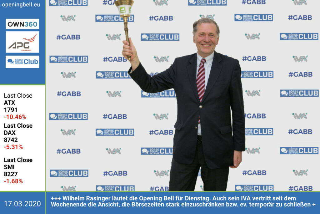 17.3.: Wilhelm Rasinger läutet die Opening Bell für Dienstag. Auch sein IVA vertritt seit dem Wochenende die Ansicht, die Börsezeiten stark einzuschränken bzw. ev. temporär zu schließen http://www.iva.or.at