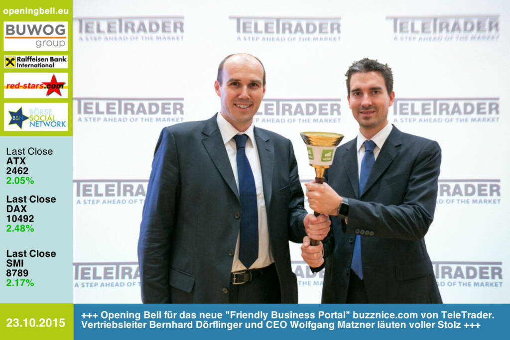 #openingbell am 23.10: Eine Opening Bell für das neue "Friendly Business Portal" http://www.buzznice.com von TeleTrader. Vertriebsleiter Bernhard Dörflinger und CEO Wolfgang Matzner läuten voller Stolz http://www.openingbell.eu
