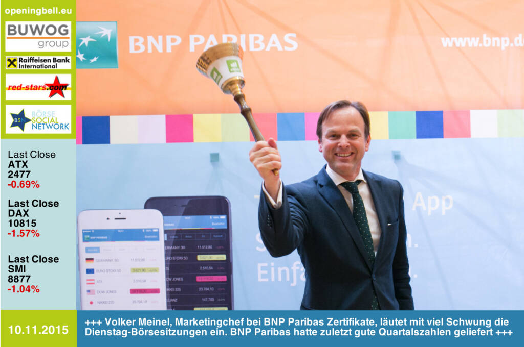 #openingbell am 10.11.: Volker Meinel, Marketingchef bei BNP Paribas Zertifikate, läutet mit der Opening Bell mit viel Schwung die Dienstag-Börsesitzungen ein. BNP Paribas hatte zuletzt tolle Quartalszahlen geliefert http://www.openingbell.eu