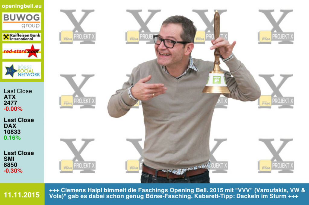 #openingbell am 11.11.: Clemens Haipl bimmelt die Faschings Opening Bell. 2015 mit "VVV" (Varoufakis, VW & Vola)" gab es dabei schon genug Börse-Fasching. Kabarett-Tipp: Dackeln im Sturm http://www.clemenshaipl.at http://www.openingbell.eu