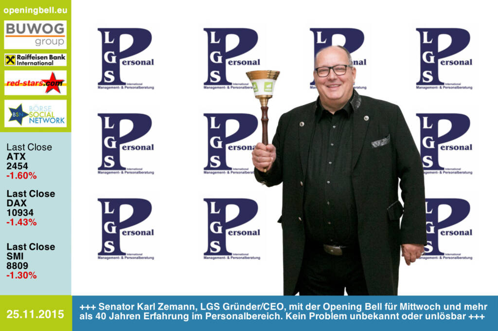 #openingbell am 25.11.: Senator Karl Zemann, LGS Gründer & CEO, mit der Opening Bell für Mittwoch und mehr als 40 Jahren Erfahrung im Personalbereich. "Kein Problem ist uns unbekannt oder unlösbar" http://www.lgs-personal.at http://www.openingbell.eu