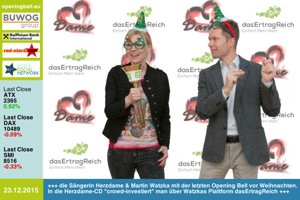 #openingbell am 23.12.: Die Sängerin Herzdame & Martin Watzka mit der letzten Opening Bell vor Weihnachten. In die Herzdame-CD "crowd-investiert" man über Watzkas Plattform dasErtragReich http://www.dasertragreich.at http://www.herzdame-music.com , siehe auch weitere Bilder mit Weihnachtshintergrund http://www.photaq.com/page/index/2269