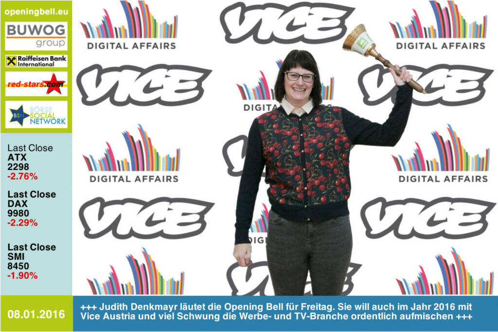 #openingbell am 8.1.: Judith Denkmayr läutet die Opening Bell für Freitag. Sie will auch im Jahr 2016 mit Vice Austria und viel Schwung die Werbe- und TV-Branche ordentlich aufmischen http://www.vice.com/alps/ http://www.openingbell.eu