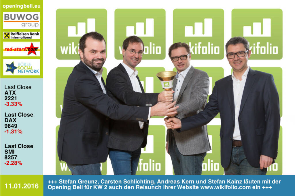 #openingbell am 11.1.: Stefan Greunz, Carsten Schlichting, Andreas Kern und Stefan Kainz läuten mit der Opening Bell für KW 2 auch den Relaunch ihrer Website http://www.wikifolio.com ein http://www.openingbell.eu