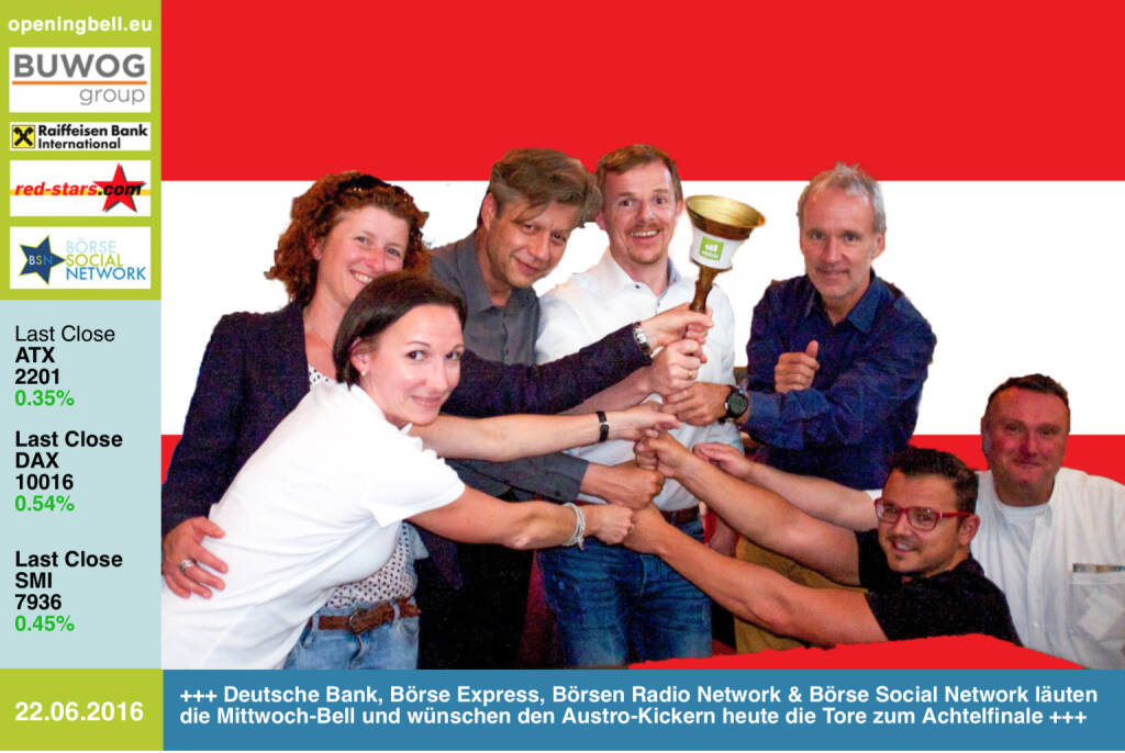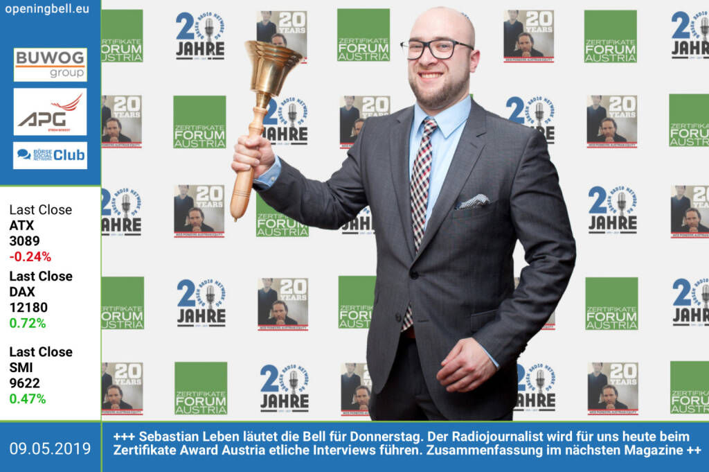 9.5.: Sebastian Leben läutet die Opening Bell für Donnerstag. Der Radiojournalist wird für uns heute beim Zertifikate Award Austria etliche Interviews führen. Zusammenfassung im nächsten http://www.boerse-social.com/magazine bzw. http://www.boersenradio.at. Und: 20 Jahren Börsen Radio Network hat ebenfalls grossen Bezug zu unserem eigenen 20er. https://www.facebook.com/groups/GeldanlageNetwork http://www.zfa.at