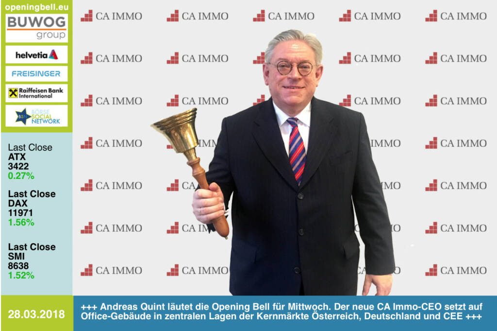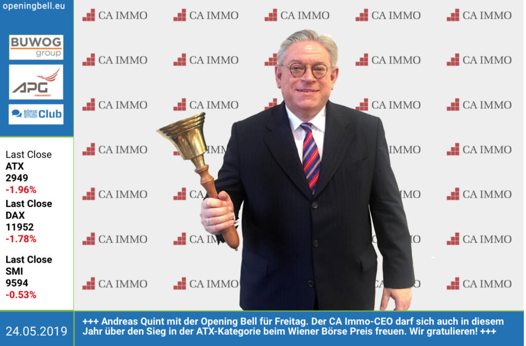 24.5.: Andreas Quint mit der Opening Bell für Freitag. Der CA Immo-CEO darf sich auch in diesem Jahr über den Sieg in der ATX-Kategorie beim Wiener Börse Preis freuen. Wir gratulieren! http://caimmo.com https://www.facebook.com/groups/GeldanlageNetwork