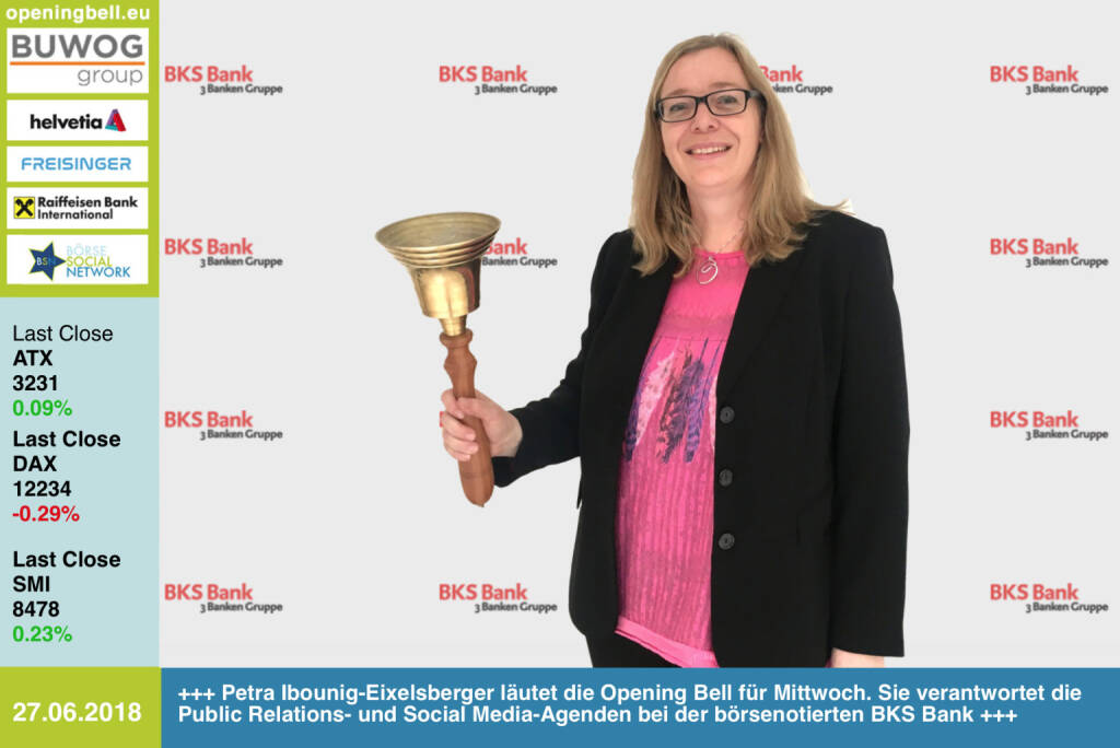 28.5.: Herta Stockbauer läutet die Opening Bell für Dienstag. Als CEO der BKS ist sie heute Host und Startspeakerin der Börse Social Network Roadshow #77 in Wien mit 6 Präsentatoren http://www.bks.at http://www.boerse-social.com/roadshow (Anmeldung geschlossen)