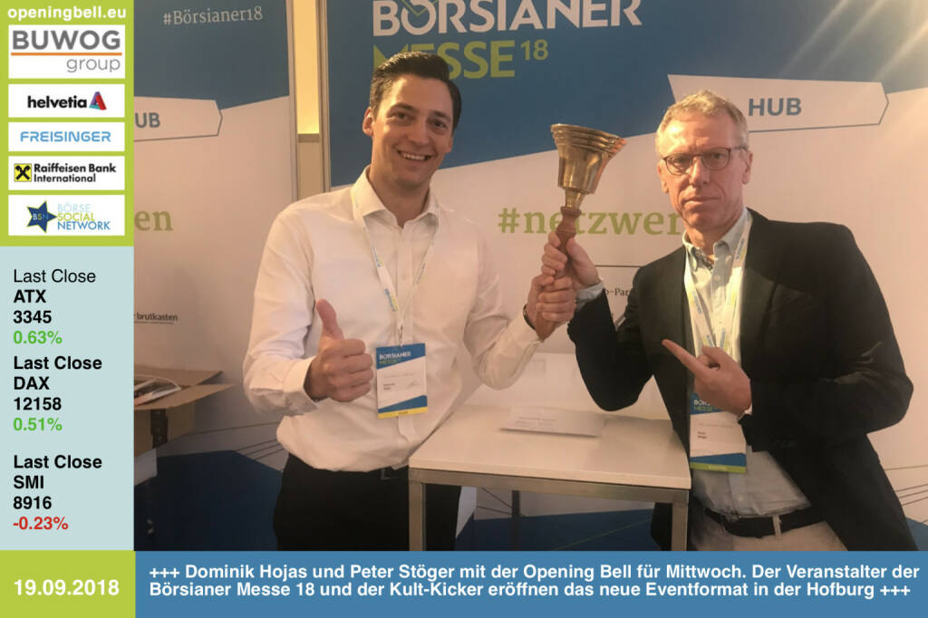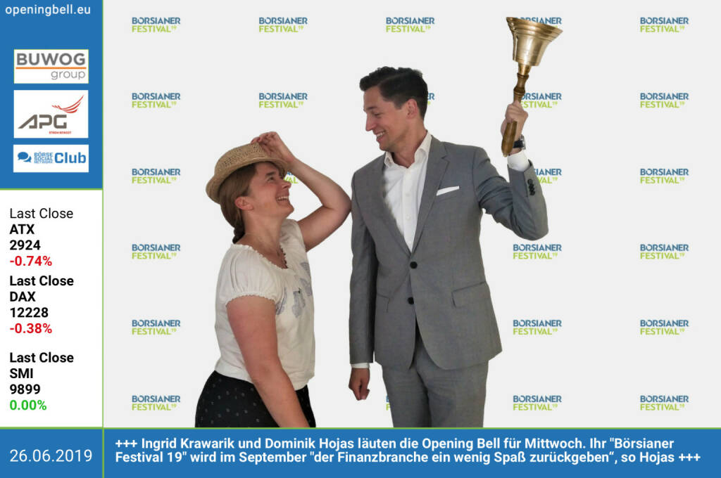 26.6.: Ingrid Krawarik und Dominik Hojas läuten die Opening Bell für Mittwoch. Ihr "Börsianer Festival 19" wird im September "der Finanzbranche ein wenig Spaß zurückgeben“, so Hojas https://boersianer-festival.com https://www.facebook.com/groups/GeldanlageNetwork