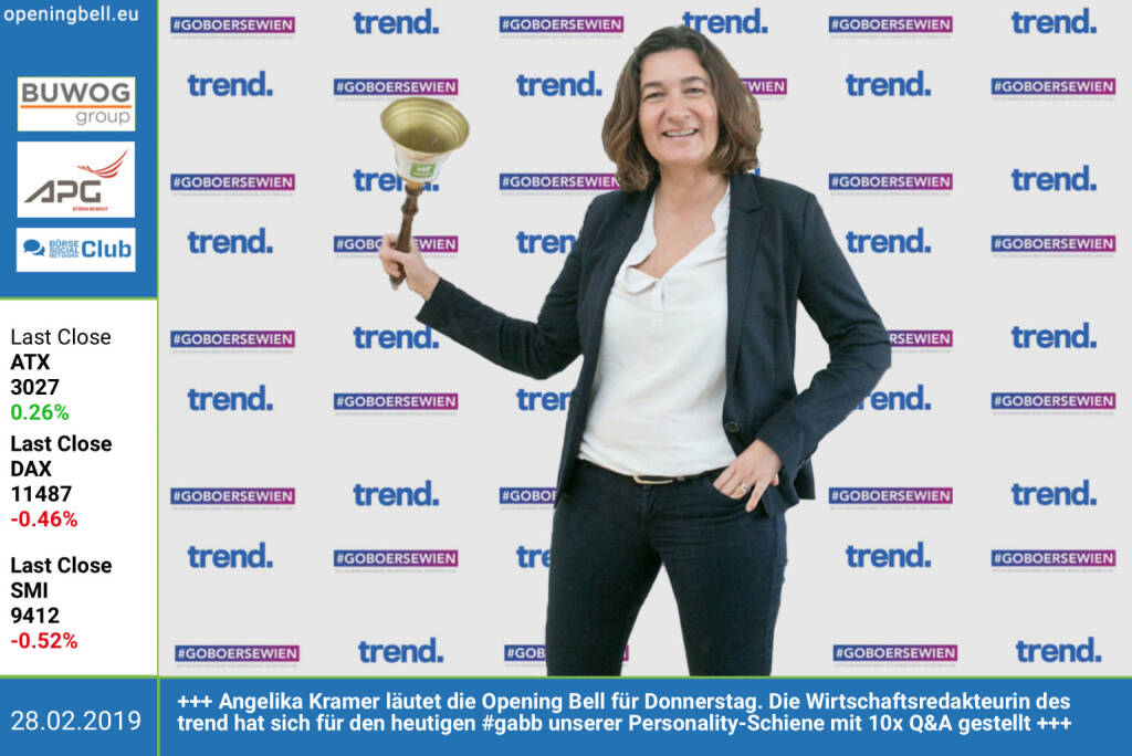 28.2.: Angelika Kramer läutet die Opening Bell für Donnerstag. Die Wirtschaftsredakteurin des trend, Führende unter https://www.extradienst.at/ed-votings/journalistenwahl-20... , hat sich für den heutigen #gabb unserer Personality-Schiene mit 10x Q&A gestellt http://www.trend.at http://www.boerse-social.com/gabb https://www.facebook.com/groups/GeldanlageNetwork