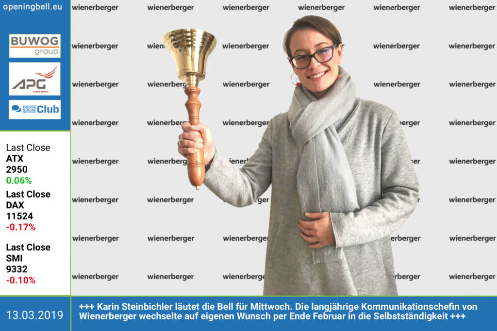 13.3.: Karin Steinbichler läutet die Opening Bell für Mittwoch. Die langjährige Kommunikationschefin von Wienerberger wechselte auf eigenen Wunsch per Ende Februar in die Selbstständigkeit und wird künftig als freie Kommunikationsberaterin tätig sein http://www.wienerberger.com https://www.facebook.com/groups/GeldanlageNetwork