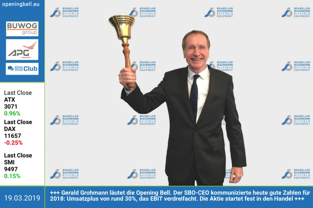 19.3.; Gerald Grohmann läutet die Opening Bell für Dienstag. Der SBO-CEO kommunizierte heute gute Zahlen für 2018: Umsatzplus von rund 30%, das EBIT verdreifacht. Die Aktie startet fest in den Handel http://www.sbo.co.at https://www.facebook.com/groups/GeldanlageNetwork
