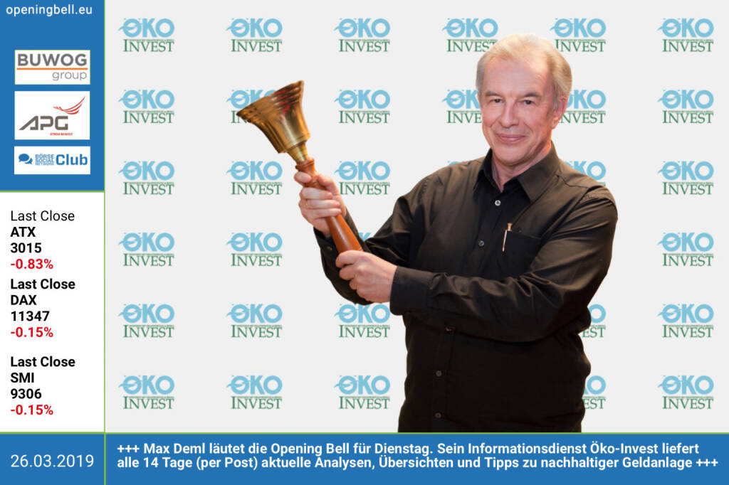 26.3.: Max Deml läutet die Opening Bell für Dienstag. Sein Informationsdienst Öko-Invest liefert alle 14 Tage (per Post) aktuelle Analysen, Übersichten und Tipps zu nachhaltiger Geldanlage http://oeko-invest.net https://www.facebook.com/groups/GeldanlageNetwork