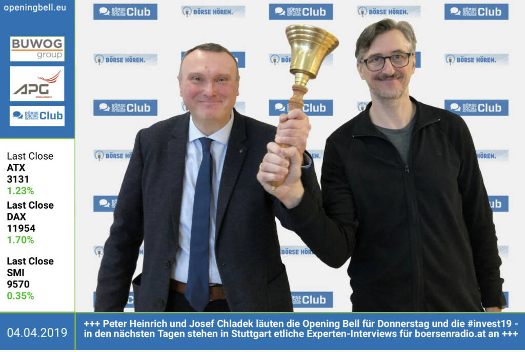 4.4.: Peter Heinrich und Josef Chladek läuten die Opening Bell für Donnerstag und die #invest19 - in den nächsten Tagen stehen in Stuttgart etliche Experten-Interviews für http://www.boersenradio.at an https://www.facebook.com/groups/GeldanlageNetwork