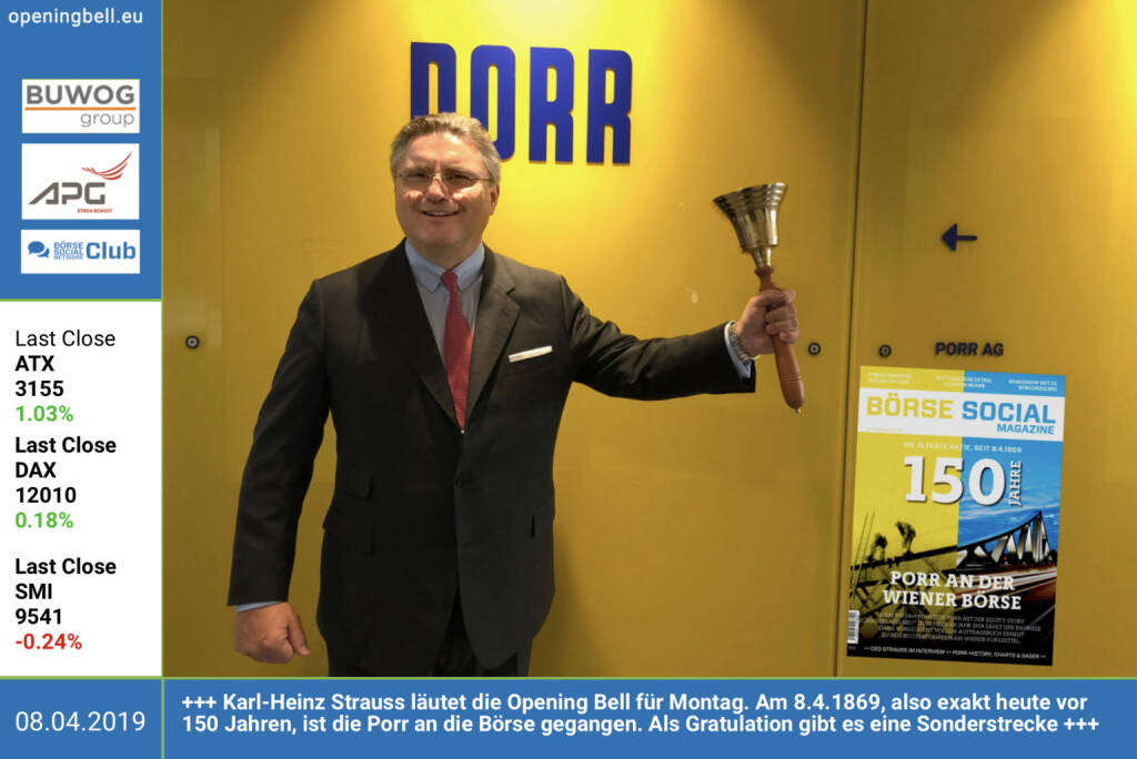 +++ Karl-Heinz Strauss läutet die Opening Bell für Montag. Am 8.4.1869, also exakt heute vor 150 Jahren, ist die Porr an die Börse gegangen. Als Gratulation gibt es eine Sonderstrecke https://boerse-social.com/porr150 http://www.porr.at https://www.facebook.com/groups/GeldanlageNetwork