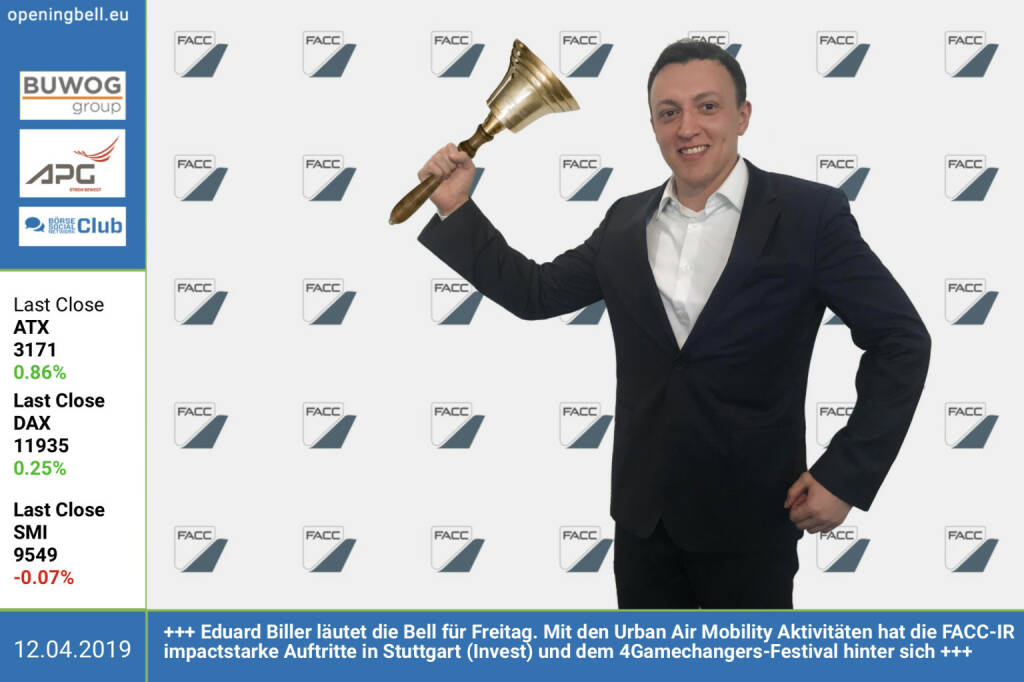 12.4.: Eduard Biller läutet die Opening Bell für Freitag. Mit den Urban Air Mobility Aktivitäten hat die FACC-IR impactstarke Auftritte in Stuttgart (Invest) und dem 4Gamechangers-Festival hinter sich http://www.facc.com https://4gamechangers.io #invest19 https://www.facebook.com/groups/GeldanlageNetwork