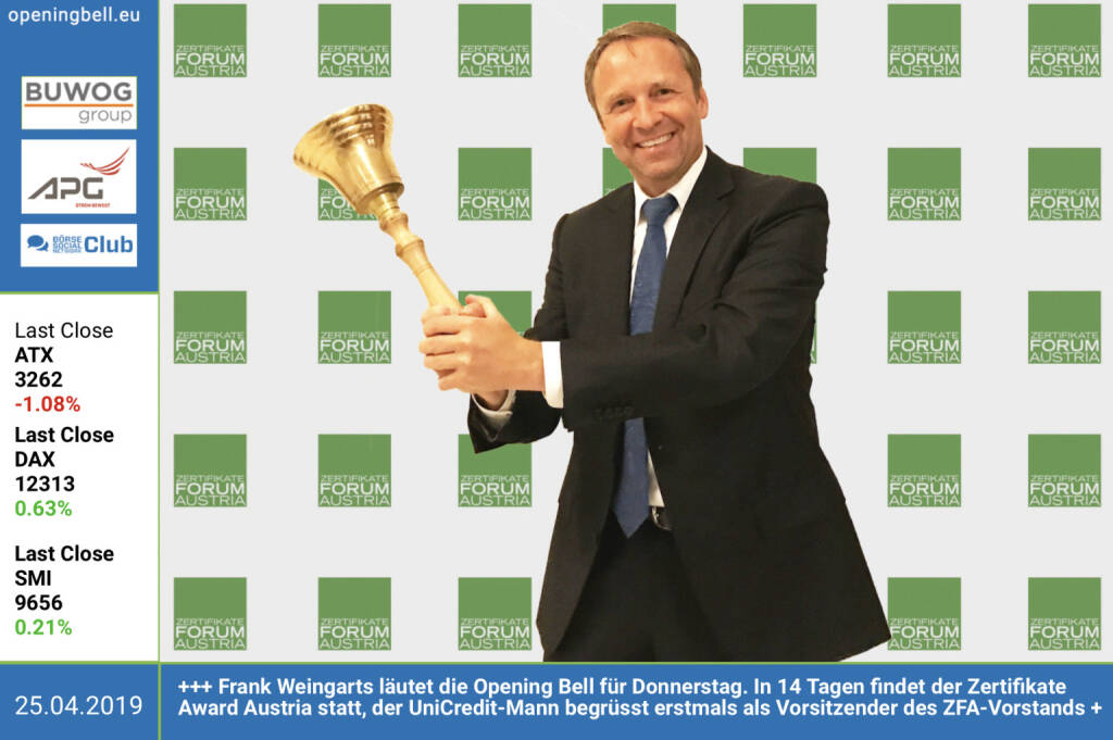 25.4: Frank Weingarts läutet die Opening Bell für Donnerstag. In 14 Tagen findet der Zertifikate Award Austria statt, der UniCredit-Mann begrüsst erstmals als Vorsitzender des ZFA-Vorstands http://www.zertifikateforum.at https://www.onemarkets.at/de.html https://www.facebook.com/groups/GeldanlageNetwork