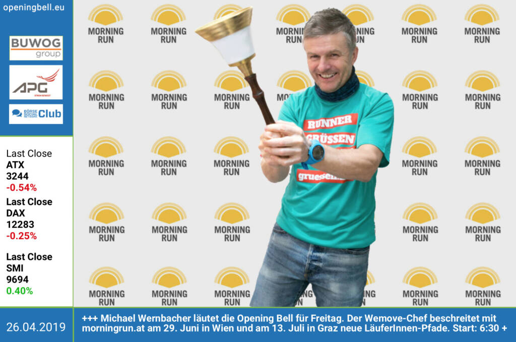26.4. Michael Wernbacher läutet die Opening Bell für Freitag. Der Wemove-Chef beschreitet mit http://www.morningrun.at am 29. Juni in Wien und am 13. Juli in Graz neue LäuferInnen-Pfade. Start: 6:30 Uhr http://www.wemove.at https://www.facebook.com/search/top/?q=sportsblogged http://www.runplugged.com