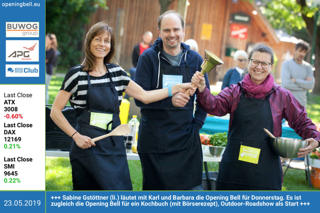 23.5.: Sabine Gstöttner (li.) läutet mit Karl und Barbara die Opening Bell für Donnerstag. Es ist zugleich die Opening Bell für ein Kochbuch. Ein Börserezept wird dabei sein, ev. mit einer Outdoor-Variante von http://www.boerse-social.com/roadshow als Start http://www.inspirin.at https://www.treffpunktessling.at https://www.facebook.com/groups/GeldanlageNetwork