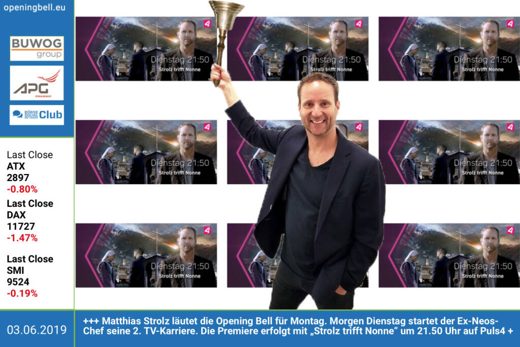 3.6.: Matthias Strolz läutet die Opening Bell für Montag. Morgen Dienstag startet der Ex-Neos-Chef seine 2. TV-Karriere. Die Premiere erfolgt mit „Strolz trifft Nonne“ um 21.50 Uhr auf Puls4 https://www.puls4.com/ http://www.strolz.eu https://www.facebook.com/groups/GeldanlageNetwork