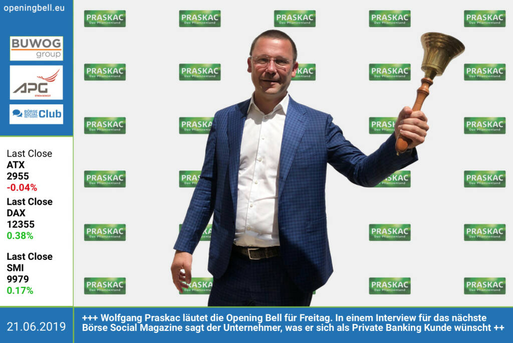21.6.: Wolfgang Praskac läutet die Opening Bell für Freitag. In einem Interview für das nächste Börse Social Magazine sagt der Unternehmer, was er sich als Private Banking Kunde wünscht https://www.praskac.at http://www.boerse-social.com/magazine https://www.facebook.com/groups/GeldanlageNetwork