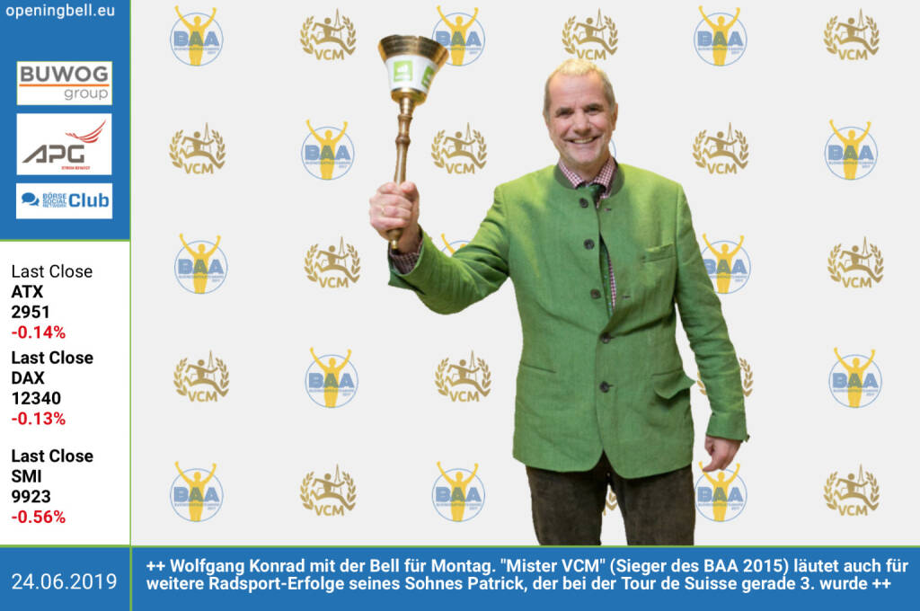 24.6.: Wolfgang Konrad mit der Opening Bell für Montag. "Mister VCM" (Sieger des BAA 2015) läutet auch für weitere Radsport-Erfolge seines Sohnes Patrick, der bei der Tour de Suisse gerade 3. wurde. Gratulation an Patrick auch von uns! https://www.tourdesuisse.ch/de/ https://www.vienna-marathon.com/ http://www.runplugged.com/baa https://www.facebook.com/search/top/?q=sportsblogged http://www.runplugged.com