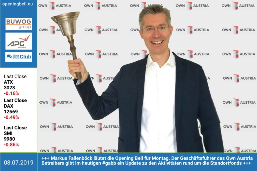 8.7.: Markus Fallenböck läutet die Opening Bell für Montag. Der Geschäftsführer des Own Austria Betreibers gibt im heutigen #gabb ein Update zu den Aktivitäten rund um die Standortfonds http://www.ownaustria.at http://www.boerse-social.com/gabb https://www.facebook.com/groups/GeldanlageNetwork
