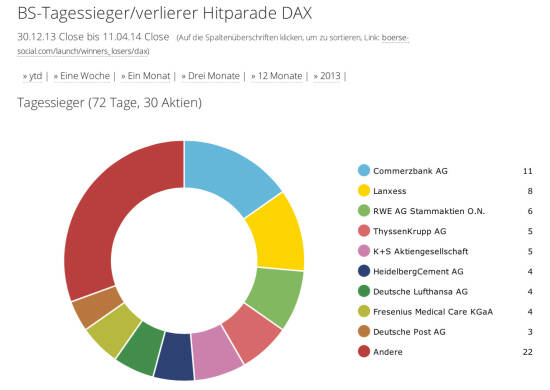 72 DAX-Handelstage 2014, Commerzbank war 11x die Nr. 1; Tabelle hier