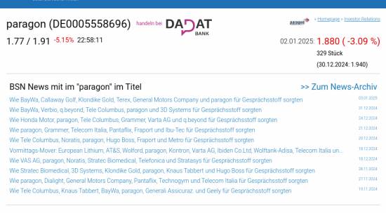 paragon am 2.1. -3,09%, Volumen 100% normaler Tage