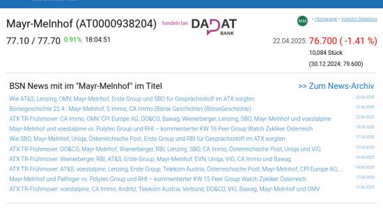 Mayr-Melnhof am 22.4. -1,41%, Volumen 115% normaler Tage