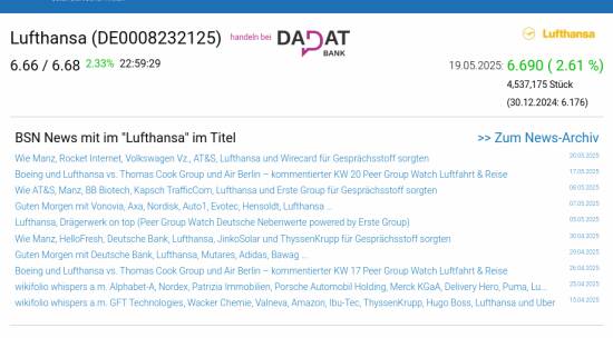Lufthansa am 19.5. 2,61%, Volumen 55% normaler Tage